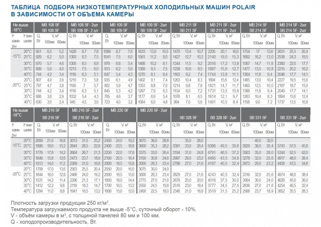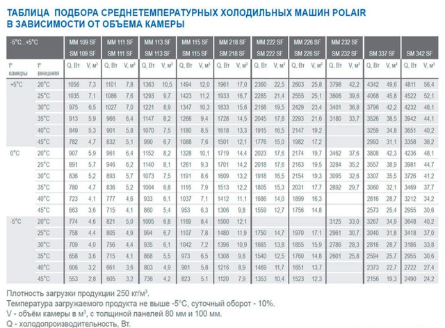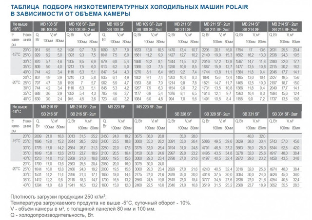 Таблица подбора холодильных машин Polair в зависимости от объема камер